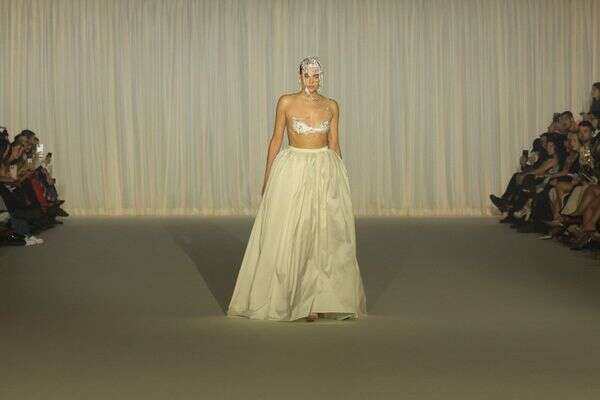 השחקנית והדוגמנית דר זוזובסקי פתחה את התצוגה ברגע שכולו נשימה אחת ארוכה. חזה חשוף, עטור באבנים נוצצות שהבריקו תחת האור הרך, וחצאית ענקית דמוית קצפת, שסחפה את המסלול כמו ענן.