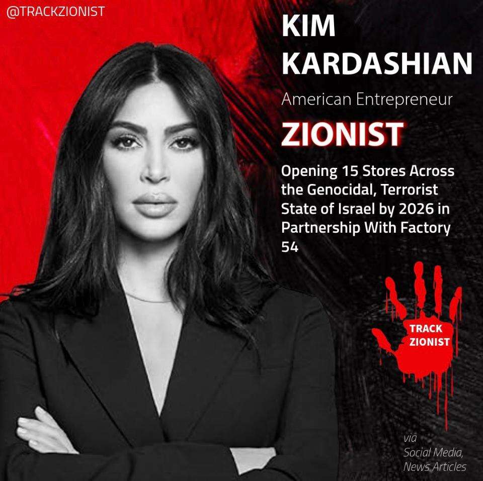 עמוד X (לשעבר טוויטר) בשם "Track Zionist", שמוצא לעצמו בכל פעם סלבס אחר שעומד בגאווה לצד ישראל, פרסם תמונה שלה על רקע שחור ואדום, עליה נכתב: "קים קרדשיאן ציונית. היא פותחת חנויות במדינת הטרור ורצח העם ישראל, בה היא תומכת".