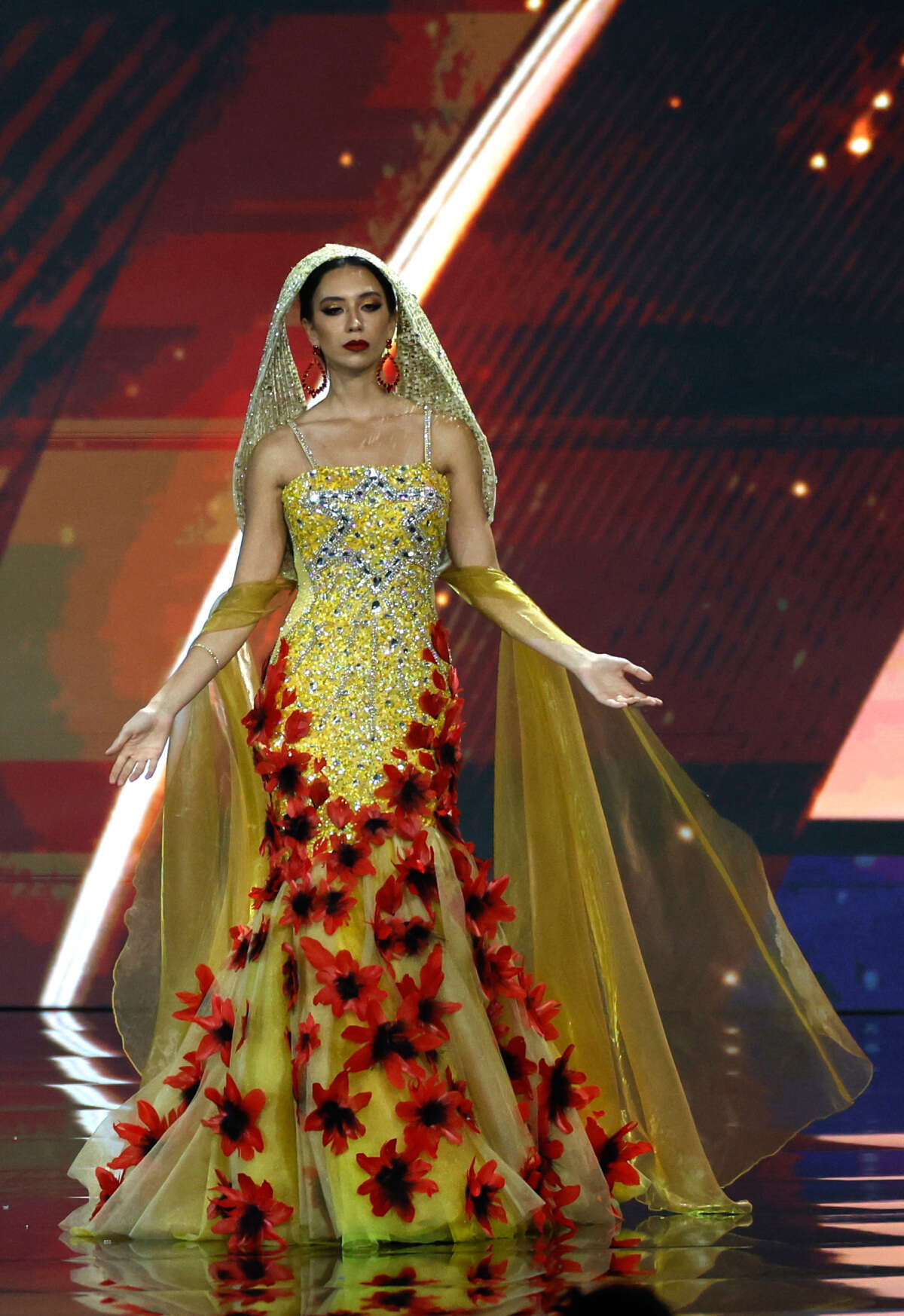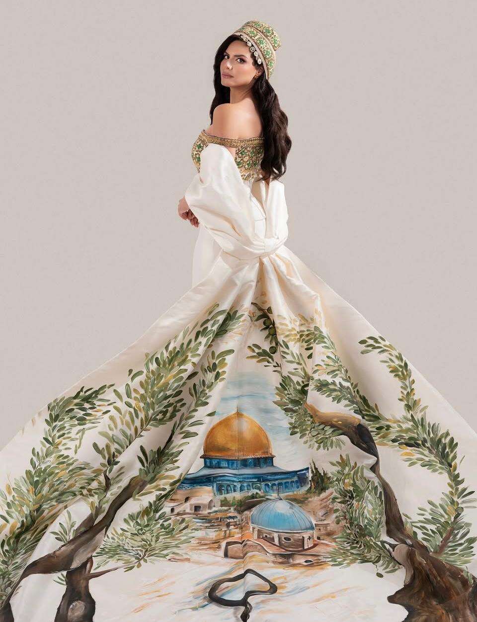 סערה בתחרות מיס יוניברס: מיס פלשתין נאדין איוב עלתה על הבמה בשלב הבגד הלאומי עם גלימה עליה מצוירת כיפת הזהב - בגד שעורר מחלוקת רבה ברשת.