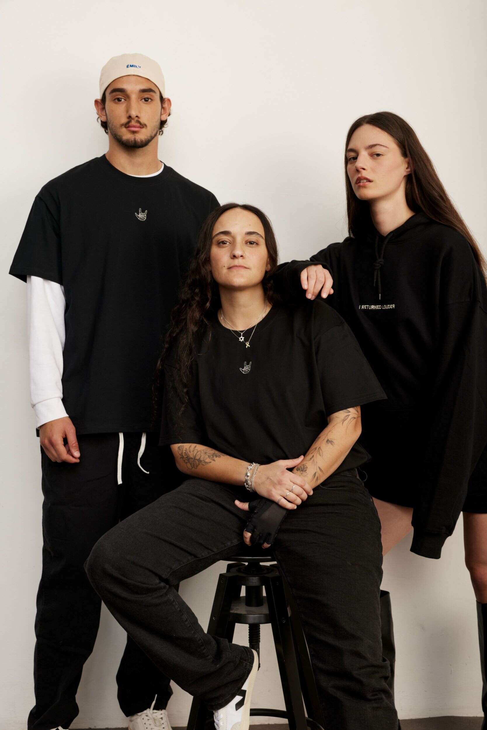 ÉMILY קולקציה משותפת סטורי ואמילי דמארי. מחיר טי שירט 189 שקלים, מחיר כובע 129 שקלים, מחיר קפוצ'ון 299 שקלים / צילום: שי פרנקו