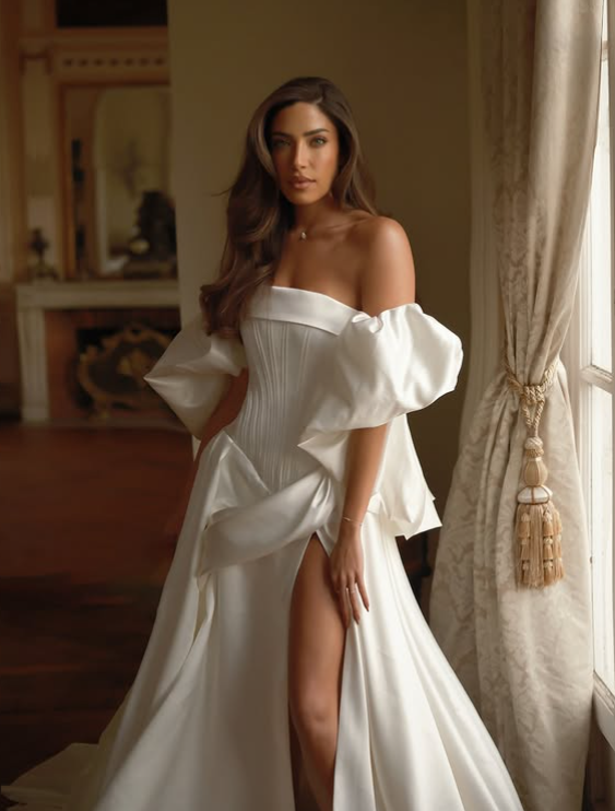 השמלה בעלת מחוך סטרפלס דרמטי, שרוולים נפוחים ונשפכים שמונחים ברכות על הזרועות, חצאית רחבה עם שסע עמוק וקפלים שמעניקים וייב רומנטי-קלאסי.
