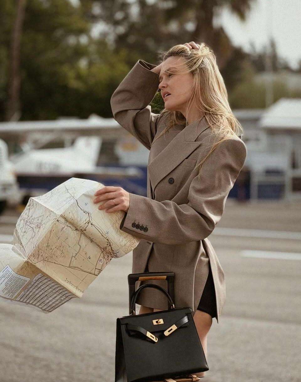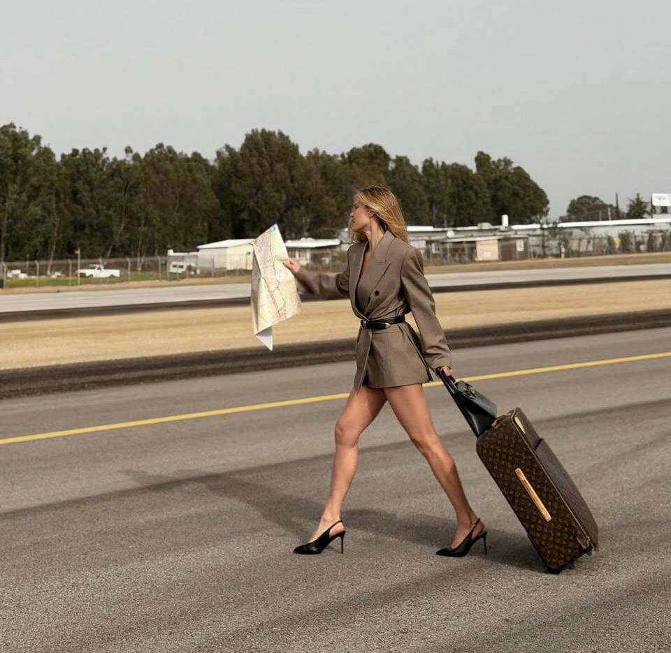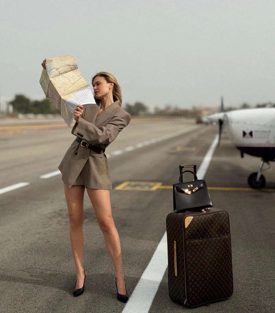 רפאלי הצטלמה על רקע מסלול המראה, כשמטוסים פרטיים מאחוריה, ולצידה הכבודה האופנתית שלה: מזוודת מונוגרם של לואי ויטון ותיק בירקין שחור של הרמס.