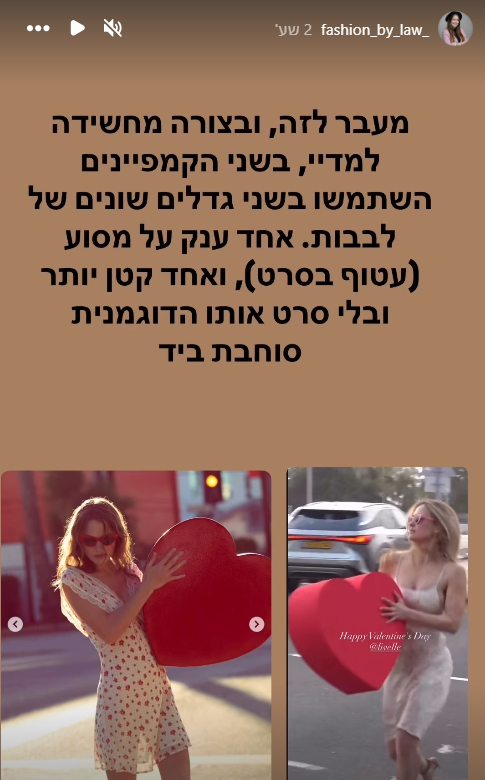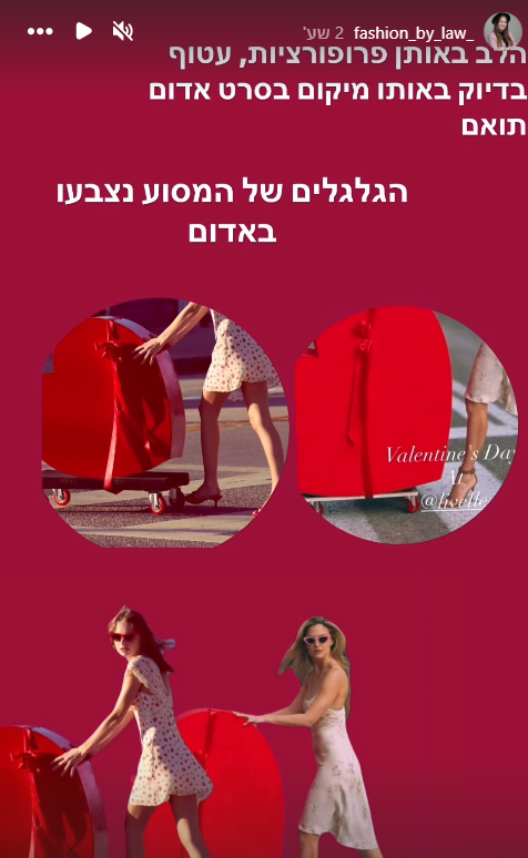 אלא שכמעט כל האלמנטים האלו מופיעים גם בקמפיין ולנטיין של מותג האופנה הבינלאומי והפופולרי For Love & Lemons. חלק מהמאפיינים, כמובן, גנריים למדי, לב אדום ליום האהבה הוא לא המצאה חדשה. אבל צירוף הפרטים הוא זה שמעורר את החשד. לב באותן פרופורציות, עטוף באותו מיקום מדויק של סרט אדום, גלגלי מסוע שנצבעו באדום (פרט שאינו מגיע "מהחנות"), שני גדלים של לבבות - אחד ענק על מסוע עטוף בסרט ואחד קטן יותר ללא סרט, שמלה בלוק כמעט זהה, בגזרה דומה, בצבעים ובפרינט דומים;