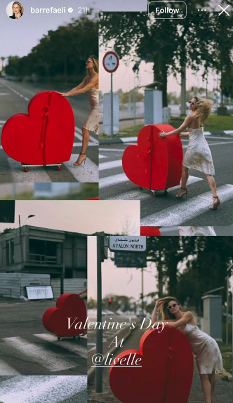 בתמונות נראית דוגמנית הבית והמייסדת בר רפאלי צועדת ברחובות תל אביב, על רקע מעבר חציה, כשהיא סוחבת לב אדום עצום עטוף בסרט. הלב מונח על מסוע שגלגליו נצבעו באדום, ורפאלי לבושה בשמלה פרחונית בהירה, משקפי שמש בולטים ועקבים. בתמונות נוספות היא מחזיקה לב קטן יותר, הפעם ללא סרט.