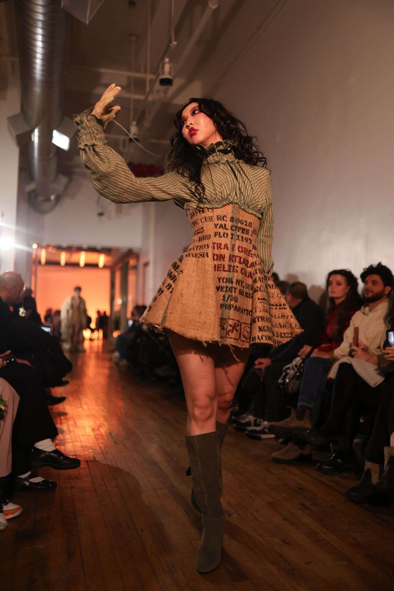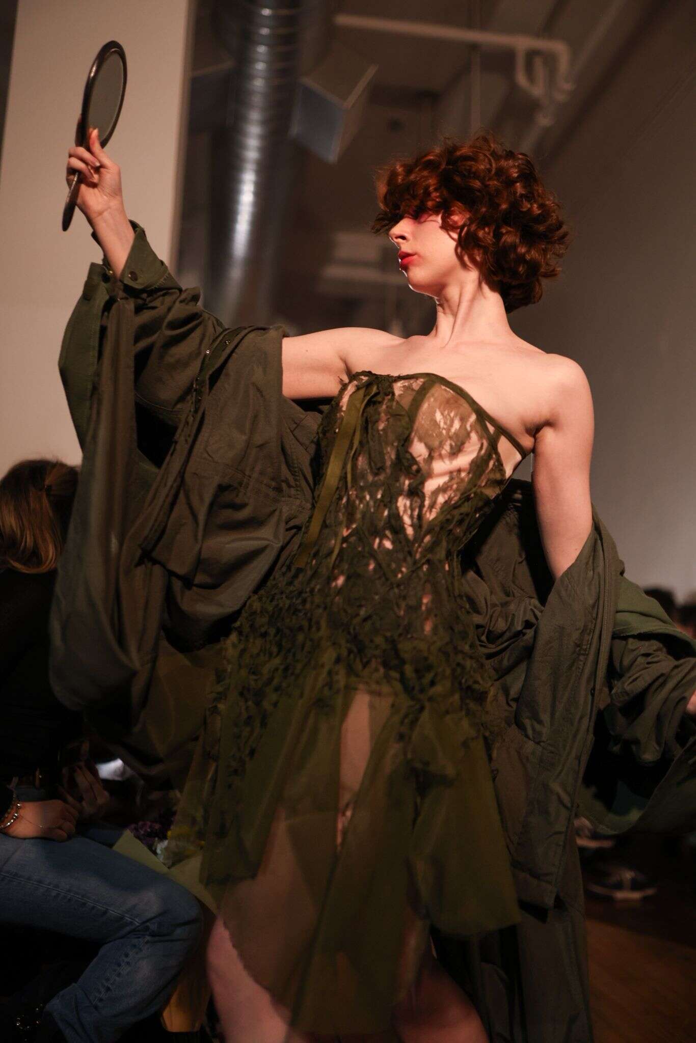הקולקציה הדרמטית והמחויטת של המעצב, שכוללת גוונים מונוכרומטיים של חום כהה, בז', שחור, לבן וירוק כהה, יוצרת רגע שבו תיאטרליות נפגשת עם אופנה, ומבקשת מהקהל לקחת חלק במאורע.