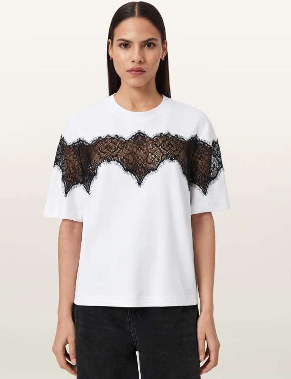 ואם כבר טישרטים אל רשת סטורי הגיע הדרופ החדש של המותג האנגלי האהוב עלינו allsaints בה דגמנו טי שירט בעיצוב נשי מבית המותג אולסיינטס, עם נגיעות תחרה עדינות, המשלבות בין קז’ואל לאלגנטי. הדגם כולל מפתח צוואר עגול, שרוולים קצרים, תוספות תחרה דקורטיביות וסיומות ריב למראה מוקפד ומלא אופי.