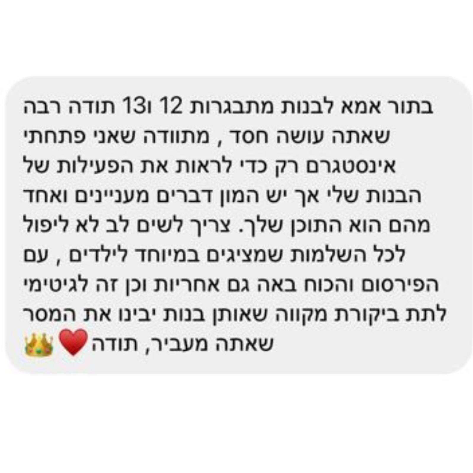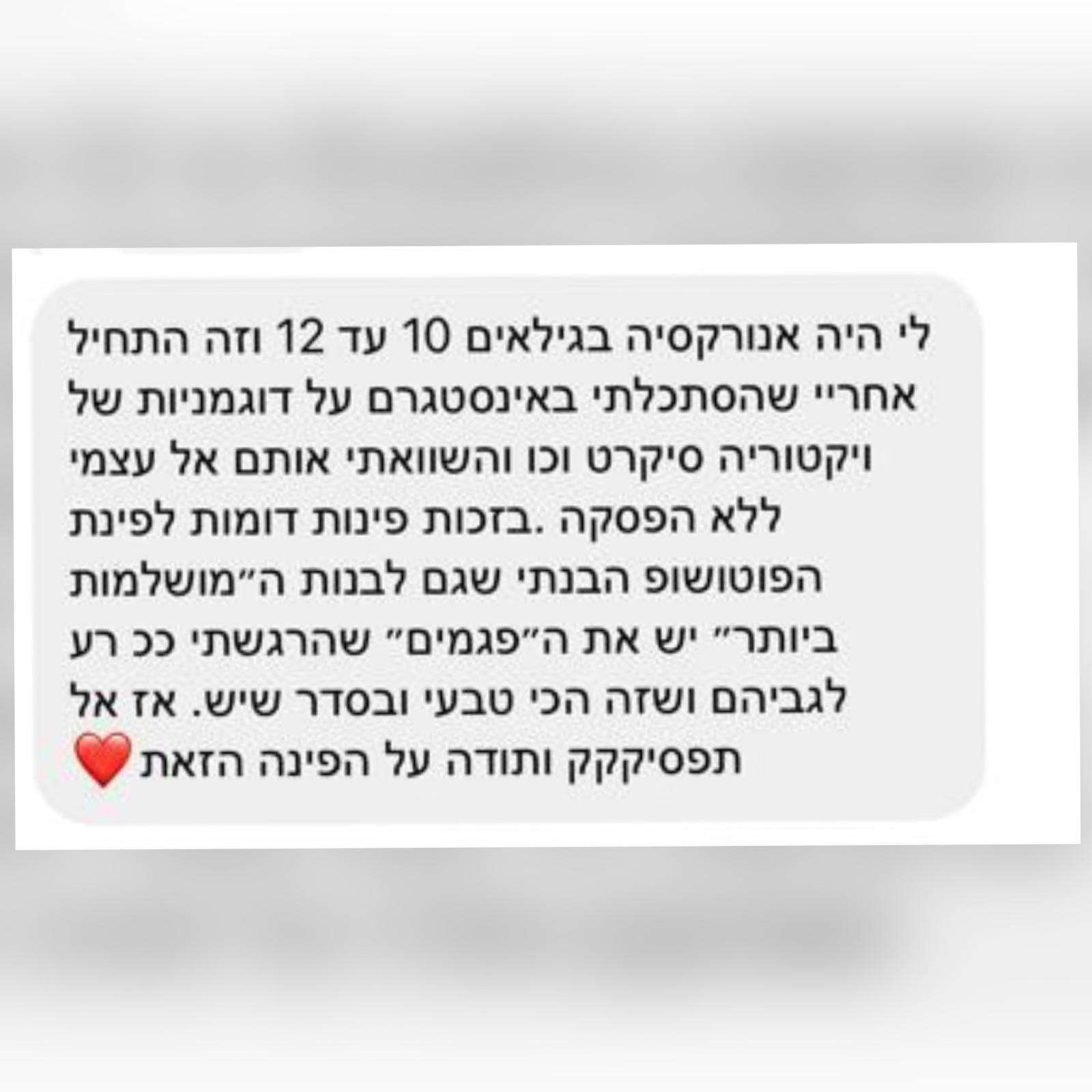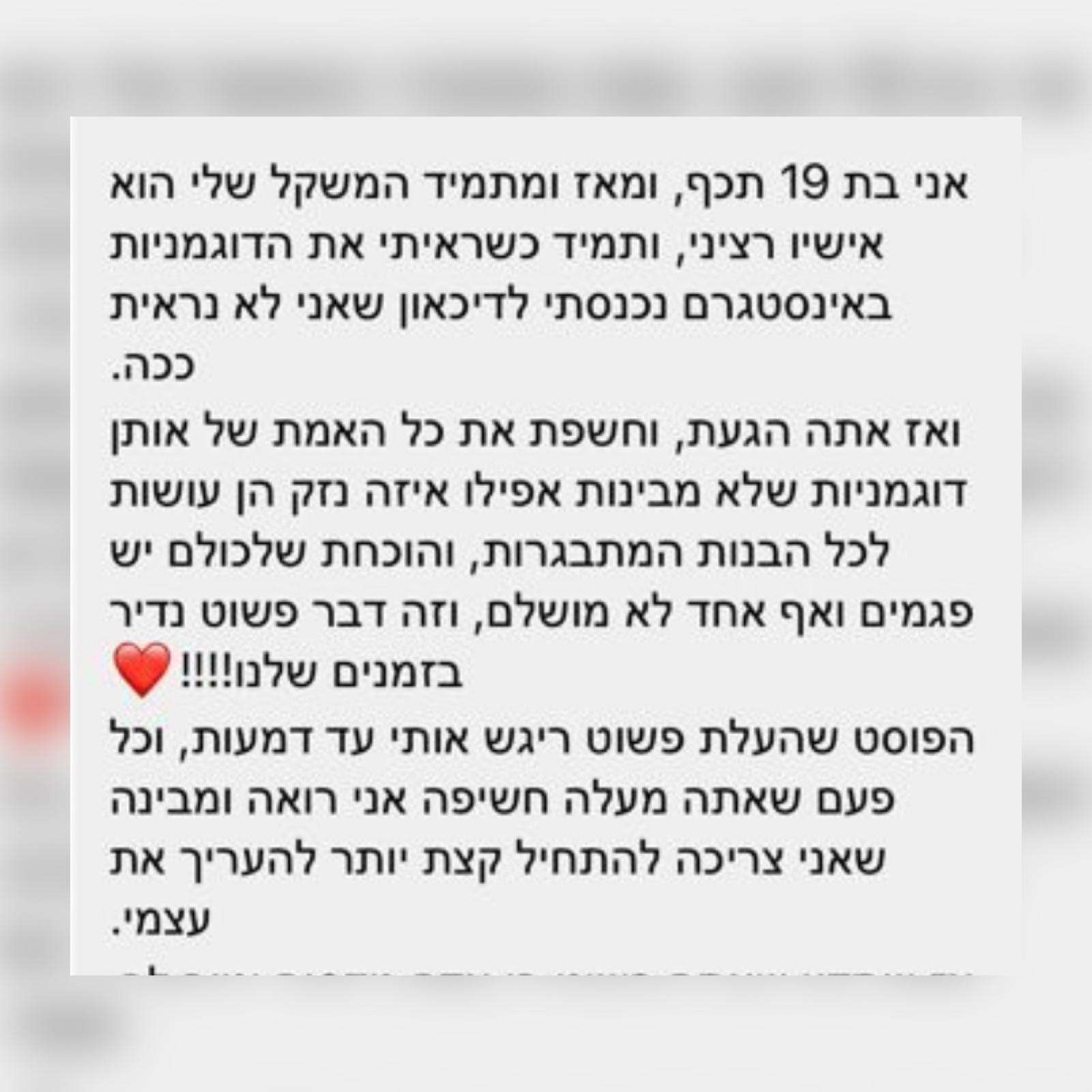 "זה שמישהו יפתח לי עכשיו את משטרת הפוטושופ לא יציל את הנערה הבאה. ההפך, אתם רק מוסיפים עוד עוול. אתם פוגעים בעוד אדם ועושים לו שיימינג בפני מדינה שלמה! אתם לא אלוהים ולא יכולים להיכנס לחיים של האחר במקום לחיות את עצמכם", הוסיפה.