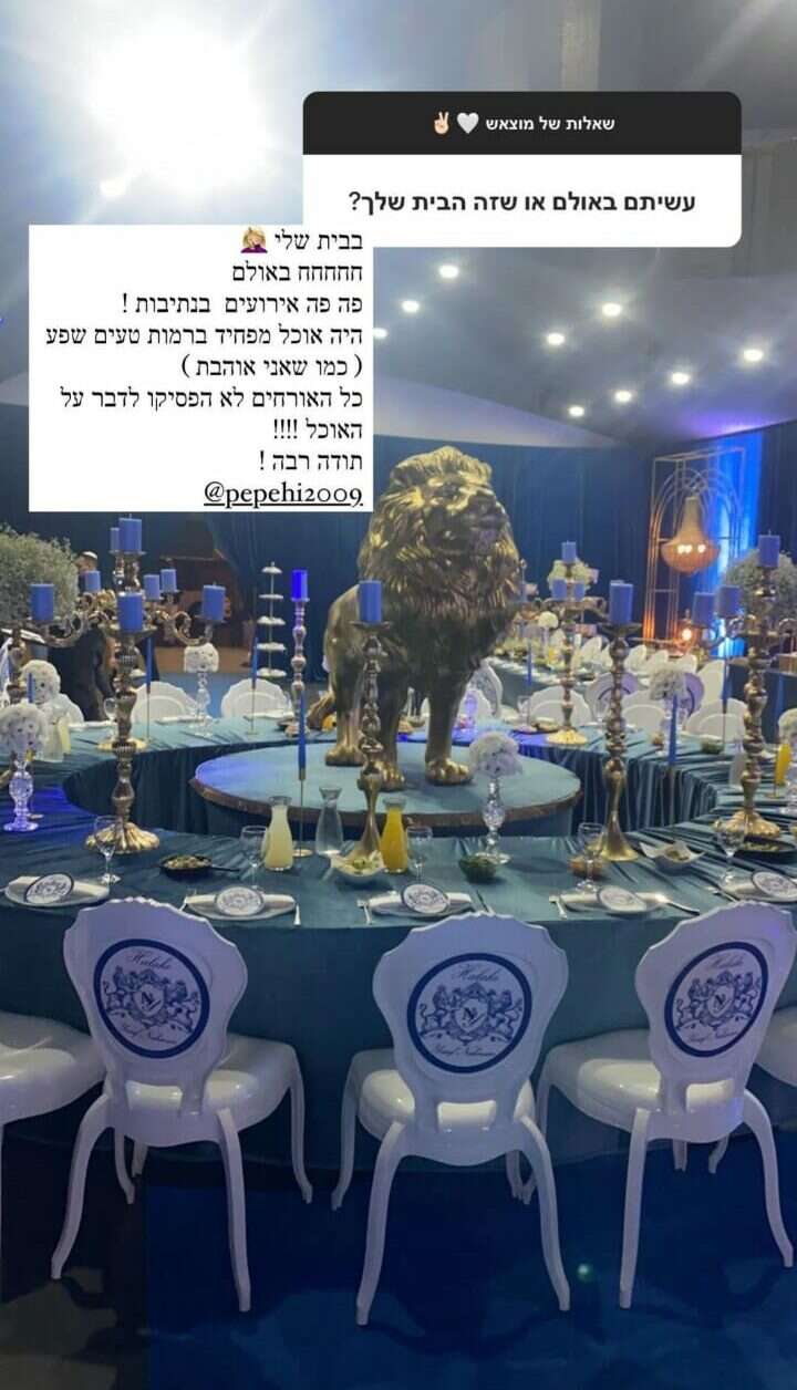האירוע התקיים באולם בנתיבות, ומה לא היה שם? עמדת פיצוחים, מארזי חלות לשבת ומארזי הכנת חלות, עמדת בלונים שבמרכזה כיסא מלכותי, מזכרות של כיפות ומטפחות ממותגות, עמדת גרפיטי ועוד. מי שאחראית על עיצוב האירוע היא ריקי'ס קייקס, שהעמידה גם תפאורה שמדמה טירה.