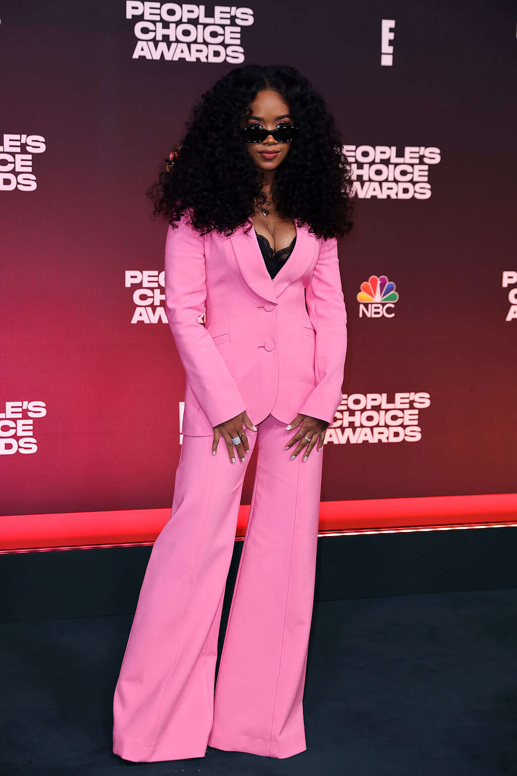 הזמרת H.E.R לבשה חליפה מחויטת בצבע ורוד בזוקה עם מחוך בצבע שחור של קרולינה הררה, אהבנו מאוד את הלוק שהינו רוצים לאמץ ומיד.
