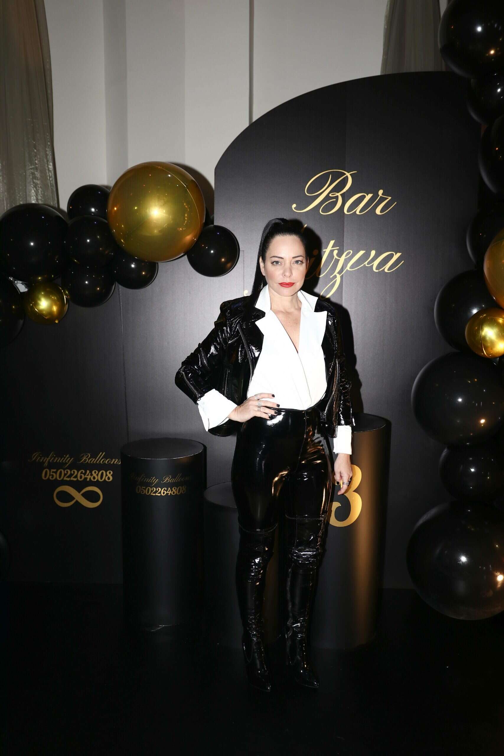 מיכל אמדורסקי בלוק טרנדי של חליפת ויניל. השילוב עם חולצה מכופתרת רשמית מתחת פחות עבד והמכנסיים היו צמודים מדי אך איכשהו עליה זה עובר. אימצנו את השיער המתוח היטב שהדגיש את השפתון האדום.