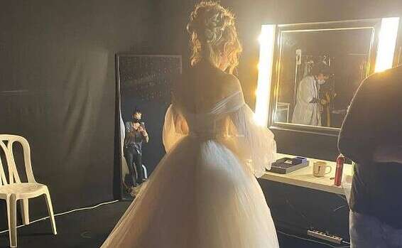 בתמונה המדוברת, לופז נמצאת במה שנראה כמו חדר הלבשה של סט צילום מקצועי, שם היא עומדת מול מראת איפור ולובשת שמלת כלה של גליה להב מבד שיפון לבן עם שובל ארוך שנשפך לאחור עם כתפיים חשופות ושרוולי פנס אלגנטיים ונשיים.
