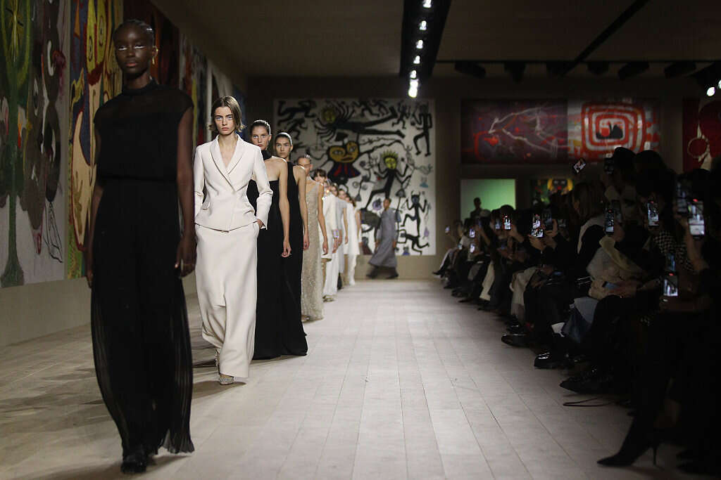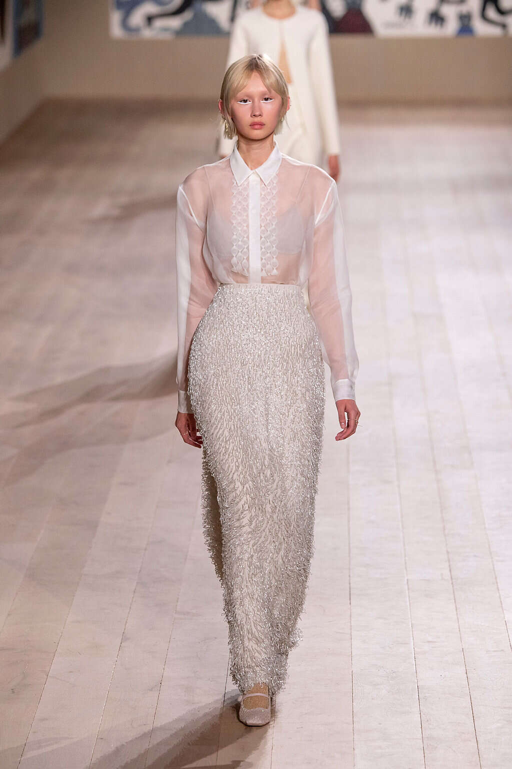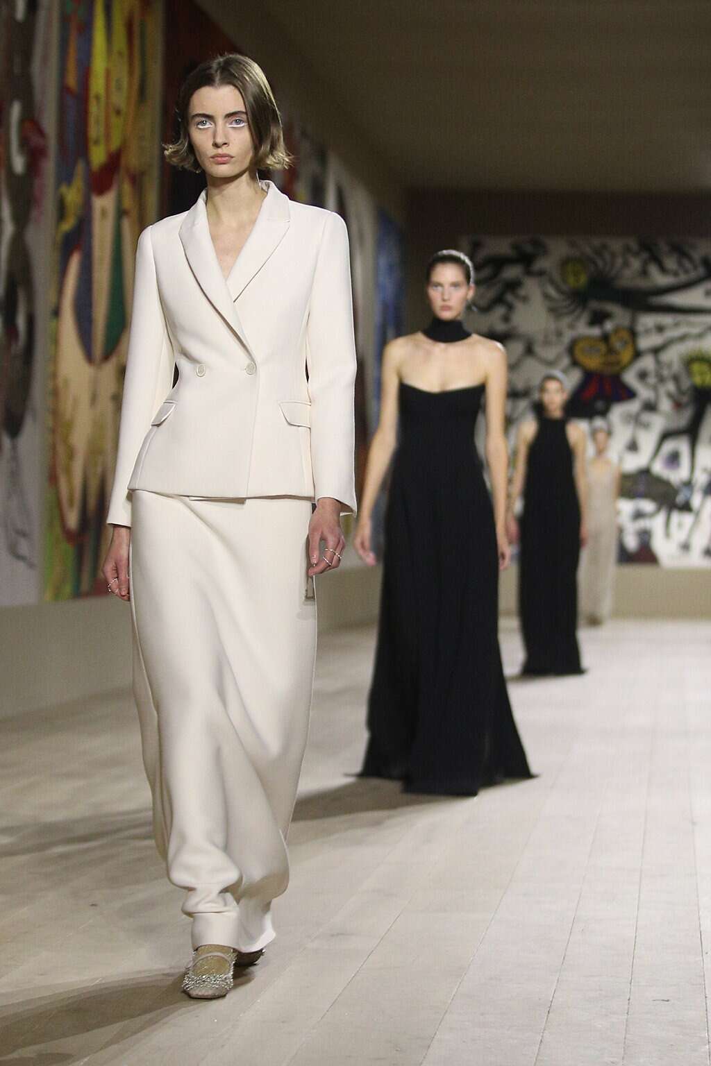 בלוק הראשון של דיור, מופיעה חליפת שני חלקים אלגנטית בצבע שמנת עם ז'קט מחויט בעל כפתרה כפולה, עם שני כפתורים ושני כיסים, שמייצר מחשוף בצורת וי, בשילוב עם חצאית מקסי ישרה ללא אלמנטים נוספים.