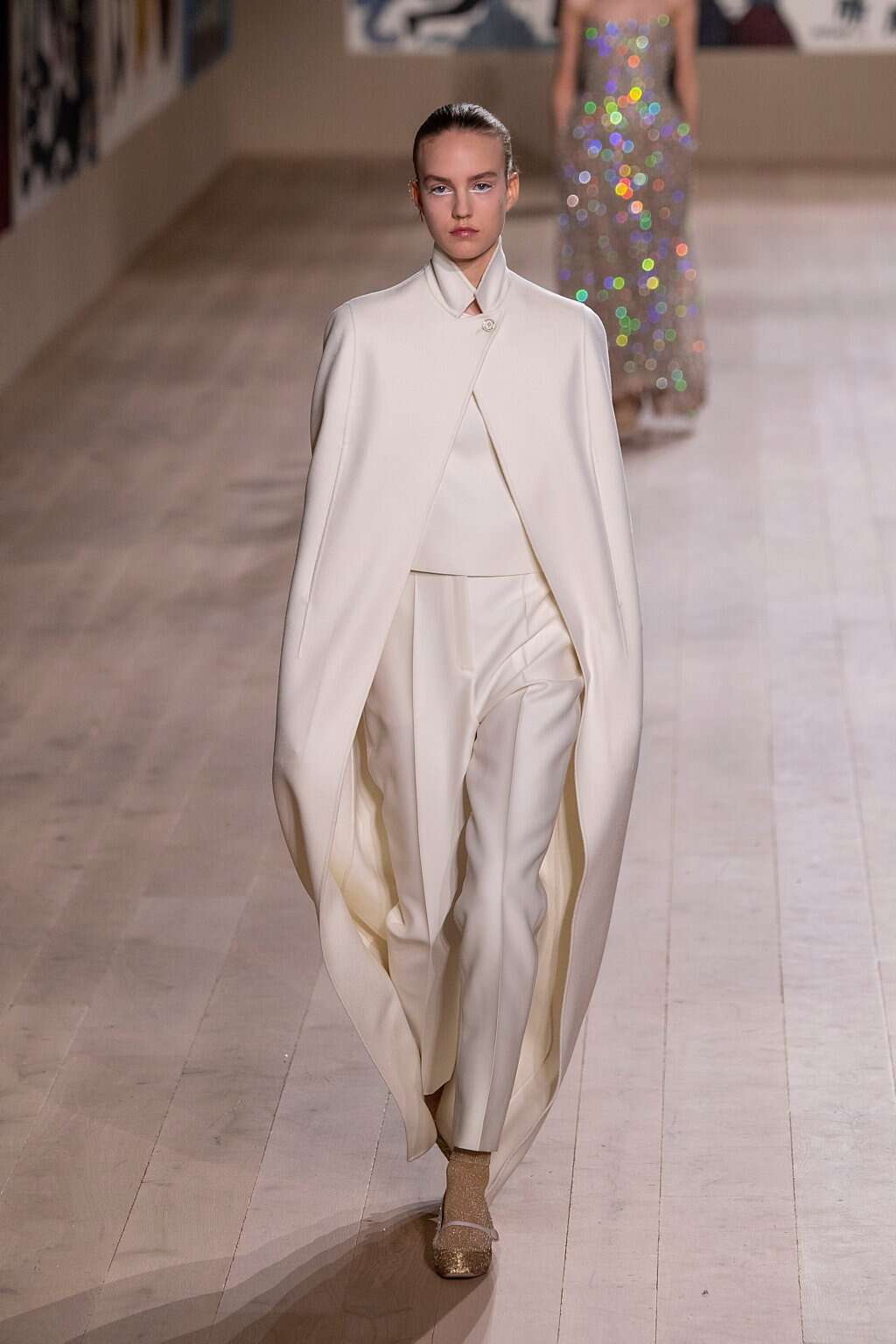 בלוק השני, בית האופנה דיור מציג חליפת שלושה חלקים בצבע שמנת עם ז'קט שכמייה ארוך עד הרצפה, בעל כפתור יחיד בחלקו עליון, בשילוב עם חולצה אלגנטית בעלת צווארון מורם ומכנסיים מחויטים עם נרביר במרכז כל רגל.
