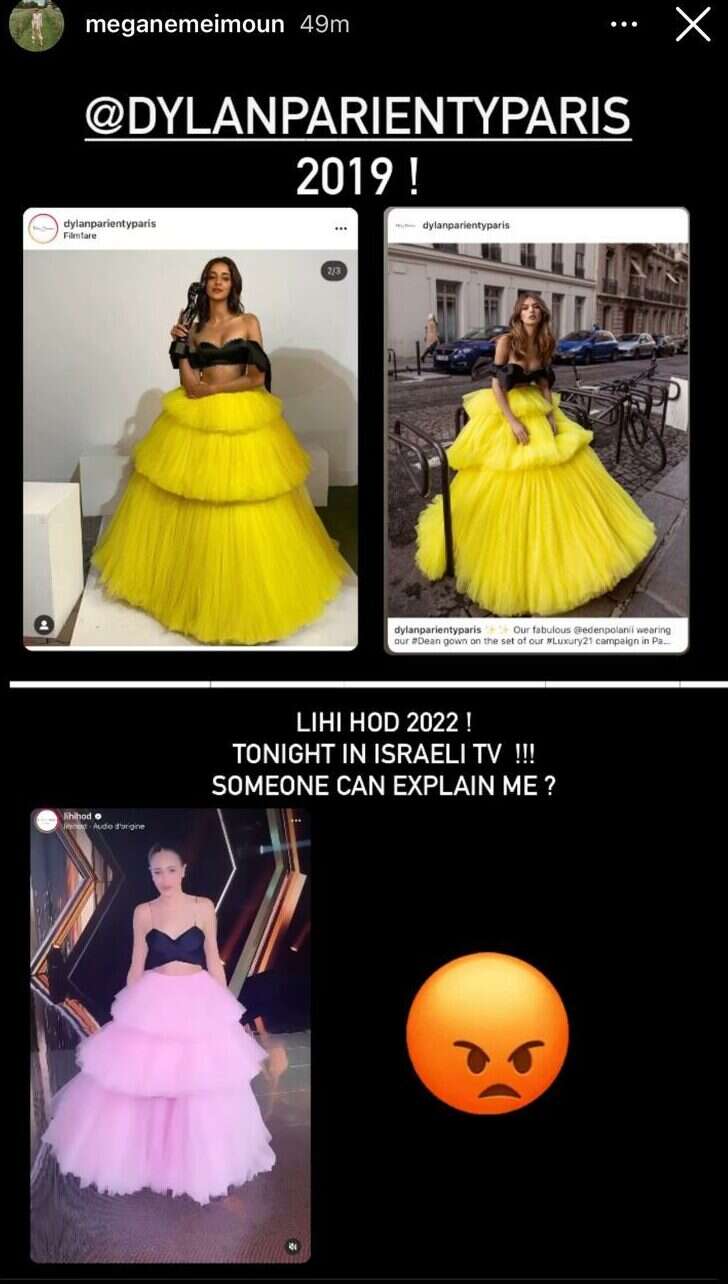 מייגן, אשתו של המעצב הישראלי צרפתי, דילן פריאני, העלתה תמונה של שמלה דומה שעיצב בעלה, לצד השמלה שעיצבה המעצבת הישראלית ליהי הוד עבור איוב תחת הכיתוב: "מישהו יכול להסביר לי?".