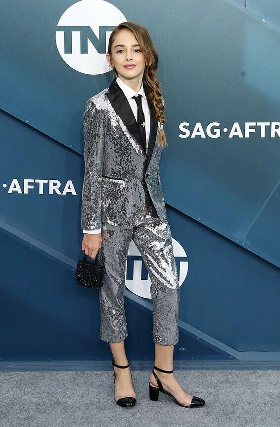 לא יאמן כמה סטייל יש לכוכבת ״היו זמנים בהוליווד״. רק בת עשר ובהחלט גונבת את ההצגה על השטיח האדום עם חליפת פאייטים כסופה, חולצה לבנה ועניבה שחורה של המותג Dsquared2. רק נעלי העקב הרגישו מעט מיותרות.