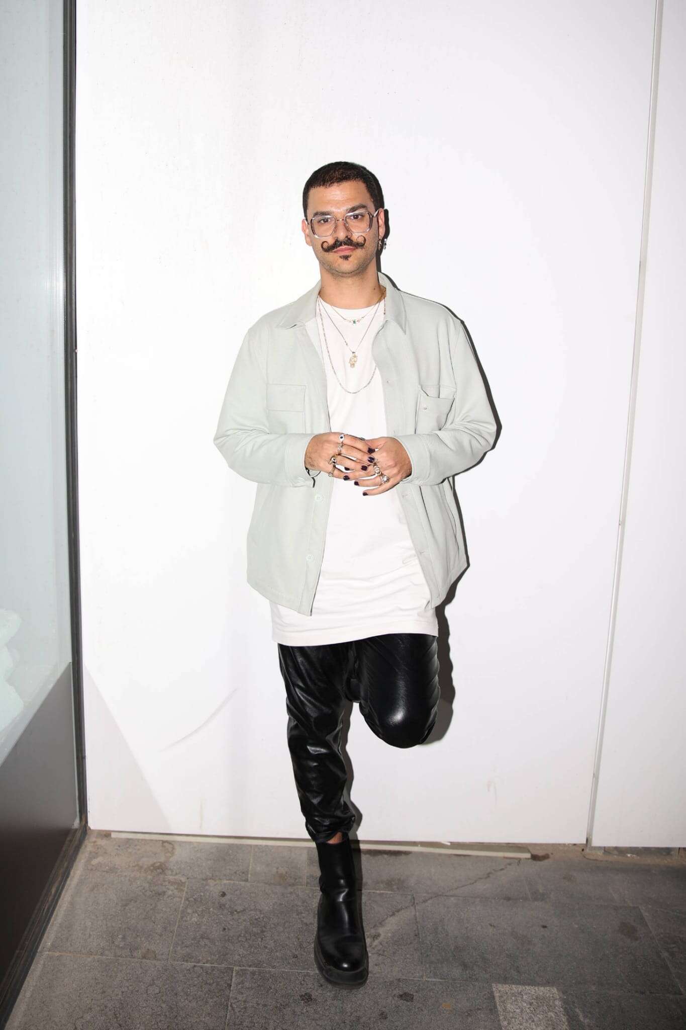 המעצב דרור קונטנטו בטוטאל לוק מעולמות הרוקנרול – מכנסי עור בשילוב עם מגפי עור, טוניקה לבנה, ז'קט בצבע אבן, לק שחור באצבעות ומלא תכשיטים. אנחנו עפים על הלוק הזה ואוהבים מאוד גברים שמעזים.