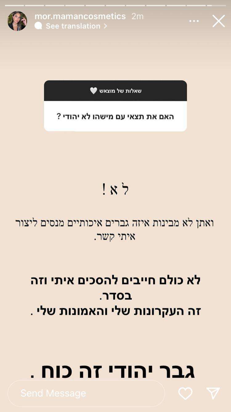 במוצאי השבת האחרונה מור ממן התפנתה להשיב על שאלות בנוגע למערכות יחסים עתידיות, והפעם הטילה פצצה אחרת כשהכריזה באופן חד־משמעי כי לא תנהל מערכת יחסים רומנטית עם גבר שאינו יהודי. מלבד זאת, דוגמנית העבר גם שיתפה את 154 אלף עוקביה בתהליך ההרזיה המרשים שלה בזמן האחרון, ונידבה עצות כיצד לעשות את זה נכון.