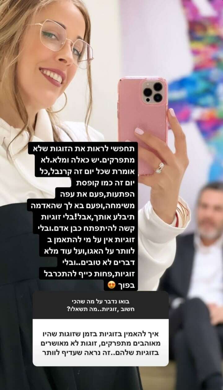 "איך להאמין בזוגיות בזמן שמסביב יש זוגות מאוהבים שמתפרקים, וזוגות שלא מאושרים בזוגיות שלהם?", שאלה עוקבת.