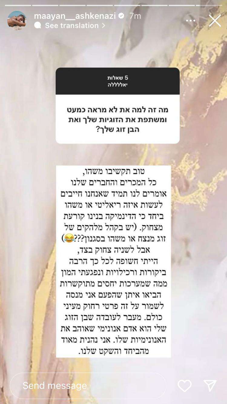 "מה זה? את לא משתפת את הזוגיות שלך?", נזפה באשכנזי אחת העוקבות, ששמה לב להבדל הדרמטי בין הקשרים. "טוב, תקשיבו משהו, כל המכרים והחברים שלנו אומרים לנו תמיד שאנחנו חייבים לעשות איזה ריאליטי או משהו ביחד, כי הדינמיקה בינינו קורעת מצחוק. יש בקהל מלהקים של זוג מנצח או משהו בסגנון?", התבדחה.