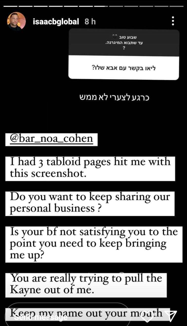 "שלושה עמודים של צהובונים שלחו לי את צילום המסך הזה", כתב בכעס אייזק בסטורי שהעלה, כשהוא מתייג את כהן, ומשם ממשיך למתקפה חריפה: "את רוצה להמשיך לשתף בחיים האישיים שלנו? החבר שלך לא מספק אותך שאת חשה את הצורך להעלות את השם שלי כל הזמן?", הקניט את כהן ואז הוסיף: "את באמת מנסה להוציא ממני את הקניה? (הכוונה כמובן לראפר והגרוש של קים קרדשיאן קניה ווסט, שידוע בציוצים הבוטים והמתלהמים שלו. ע"ח), "תשמרי על השם שלי מחוץ לפה שלך", חתם אייזק בזעם את הסטורי הזועם שחלק עם 12.8 אלף עוקביו אתמול (שבת).