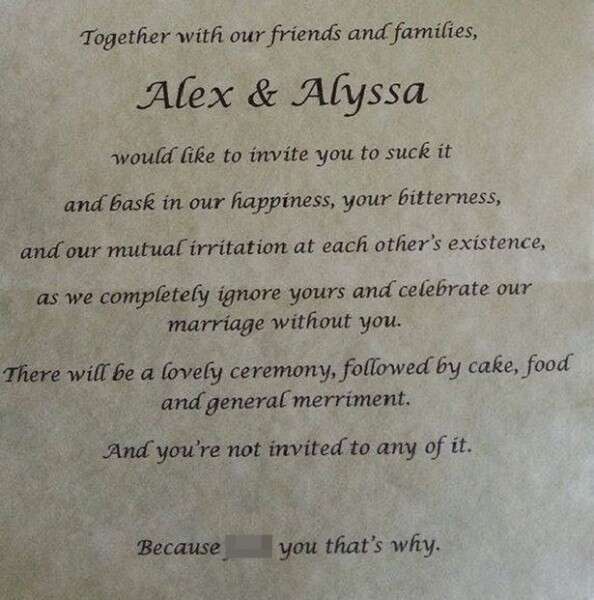 "ההזמנה" דווקא נפתחה באופן מסורתי ונעים ולפתע הפך להיות ברוטאלי ואלים: "יחד עם חברנו ומשפחתנו אלכס ואליסה מזמינים אתכם...ללכת לעזאזל ולהצטרף לאושר שלנו, המרירות שלכם, בזמן שאנחנו מתעלמים מכם לחלוטין וחוגגים את נישואינו בלעדיכם. יהיה טקס נפלא עם עוגה, אוכל ושלל הפתעות – ואתם לא מוזמנים". סופו של המכתב הוא אולי הקשה ביותר: "ולמה אנחנו כותבים את כל זה כי לכו לעזאזל – בגלל זה".