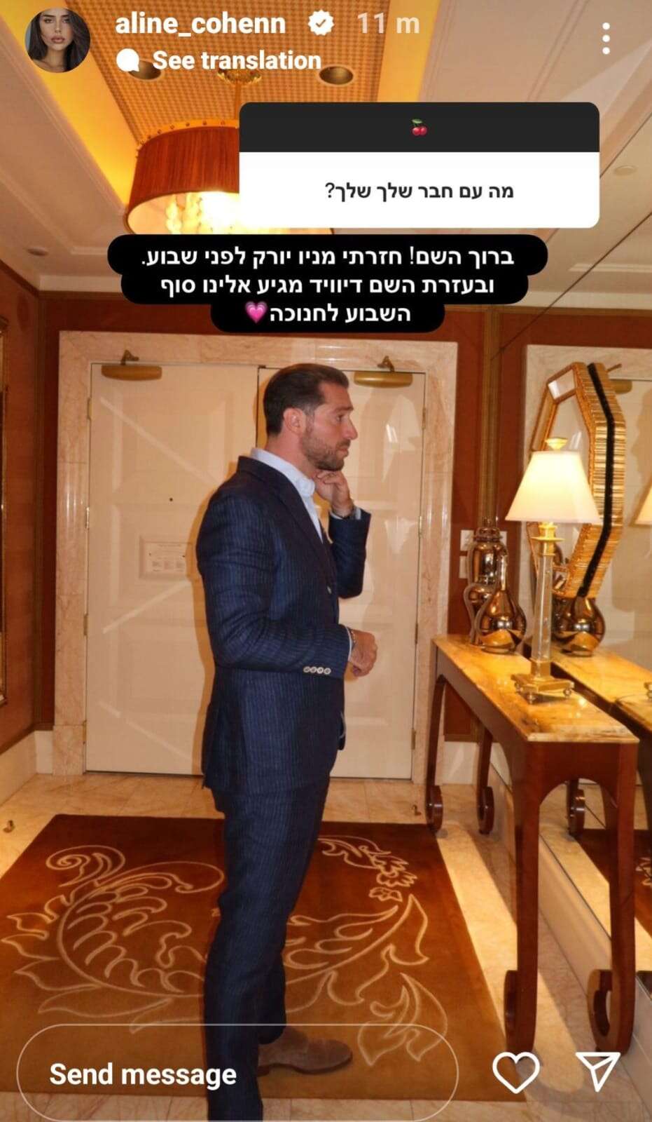 "מה עם החבר שלך שלך?", ביקשו עוקביה לדעת, ולמרות הרצון לשמור על הזוגיות הרחק מעיני המצלמות, אלין שיתפה תמונה של דיוויד לבוש בחליפה ועומד מול מראה וכתבה: "ברוך השם. חזרתי מניו יורק לפני שבוע ובעזרת השם דיוויד מגיע אלינו בסוף השבוע לחנוכה", שיתפה בהתרגשות על ביקורו הקרוב של בן זוגה בארץ.