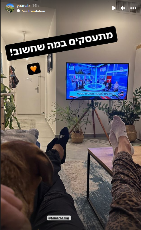 "מתעסקים במה שחשוב", כתבה יואנה על תמונה בה נראות הרגליים של שניהם ללא הפנים כשברקע נראית הטלוויזיה פתוחה על שידור בנושא עסקת החטופים.