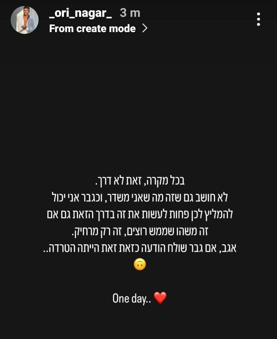 "כגבר אני יכול להמליץ לכן פחות לעשות את זה בדרך הזאת גם אם זה משהו שממש רוצים. זה רק מרחיק", הבהיר וביקש להדגיש בסופו של הסטורי: "אם גבר שולח הודעה כזאת זאת הייתה הטרדה".