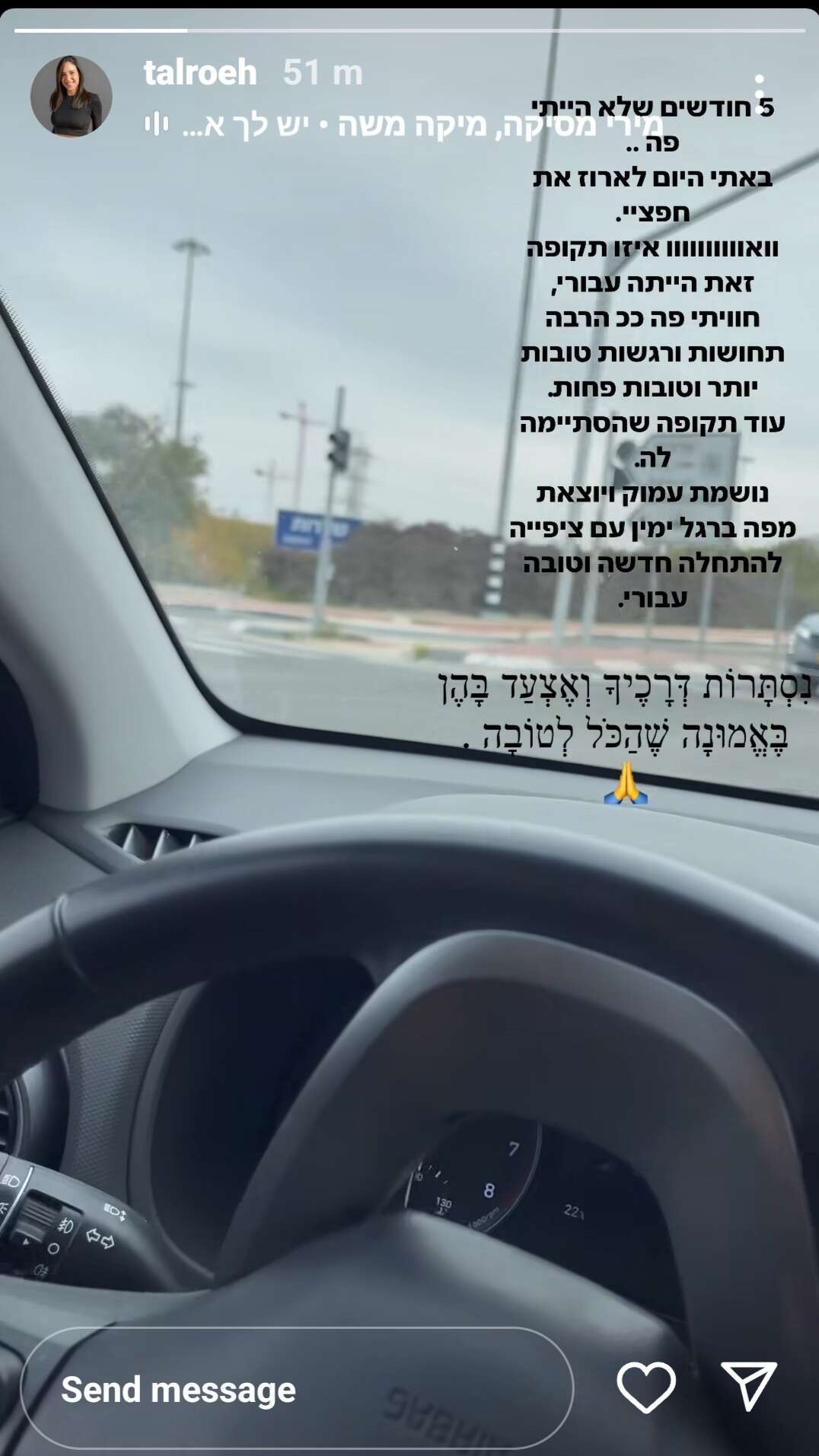 "נושמת עמוק ויוצאת מפה ברגל ימין עם ציפייה להתחלה חדשה וטובה עבורי", כתבה וחתמה את דבריה בציטוט: "נִסְתָּרוֹת דְּרָכֶיךָ וְאֶצְעַד בָּהֶן בֶּאֱמוּנָה שֶׁהַכֹּל לְטוֹבָה".