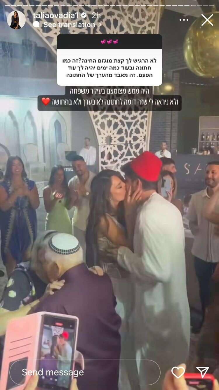 "היה ממש מצומצם, ובעיקר משפחה, ולא נראה לי שזה דומה לחתונה. לא בערך ולא בתחושה", השיבה טליה על רקע סרטון קצר שלה עם שחף מהחינה של השניים שבו תועדו כשהם נושקים אחד לשנייה.