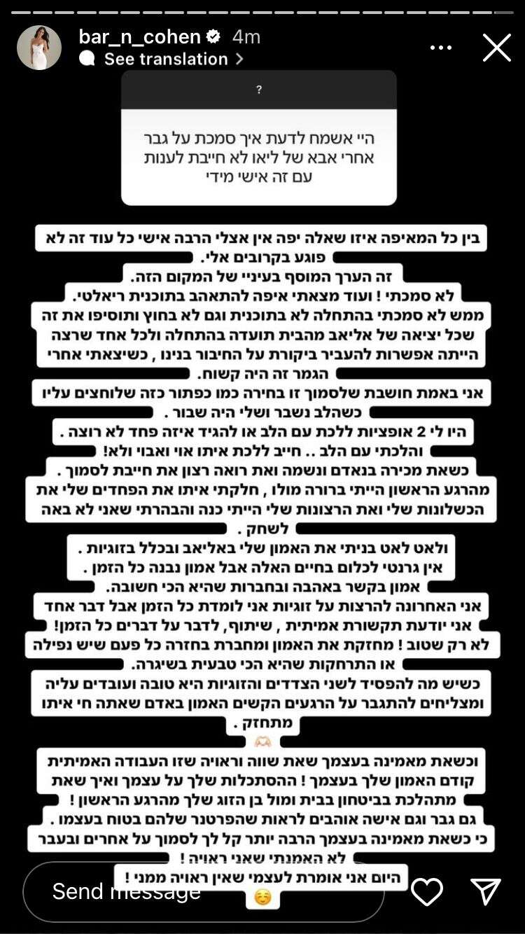 בר כהן בחרה היום (שלישי) בצעד שמסמל יותר מכל את החזרה לשגרה אצל משפיעניות הרשת ופתחה תיבת שאלות לעוקביה באינסטגרם. כבר בשאלה הראשונה שנשלחה אליה, היא שידרה פתיחות גדולה כשסיפרה באומץ על הלב שסירב תחילה לסמוך על אליאב טעטי, מי שהפך לפני קצת פחות מחודש לבעלה ואותו הכירה כזכור במהלך השתתפותם של השניים בריאליטי המפורסם.