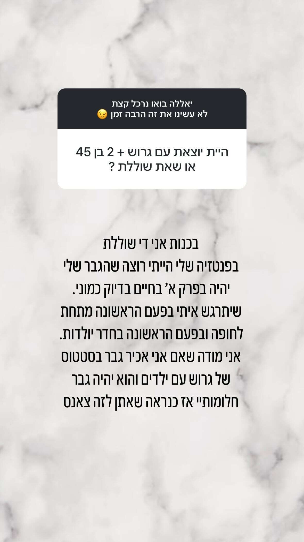 בהמשך נשאלה אם הייתה יוצאת עם גרוש בן 45 פלוס שניים, והשיבה בכנות שלא, אך סייגה את דבריה. "אני די שוללת. בפנטזיה שלי הייתי רוצה שהגבר שלי יהיה בפרק א' בחיים, בדיוק כמוני. שיתרגש איתי בפעם הראשונה מתחת לחופה ובפעם הראשונה בחדר יולדות. אני מודה שאם אכיר גבר בסטטוס של גרוש עם ילדים והוא יהיה גבר חלומותיי, אז כנראה שאתן לזה צ'אנס", הבהירה.