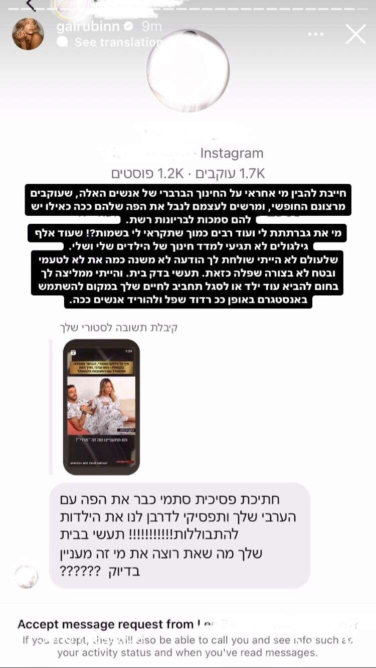 הביקורת שספגה גל רובין בזמן האחרון הייתה עוצמתית במיוחד. מאז שדווח בעמודי הרכילות על הזוגיות החדשה שהיא מנהלת עם כוכב "המירוץ למיליון" הערבי מחמוד צפורי, הרשת סערה. נראה שגם כעת, שבועות ארוכים אחרי ששיתפה את העולם בקשר הרומנטי, היא עדיין נאלצת להתמודד עם הודעות קשות, לעיתים גם מצד אנשים שבוחרים לעקוב ולהיחשף לתכניה באינסטגרם. היום (חמישי) היא העלתה צילום מסך של הודעה קשה שנשלחה אליה מצד עוקבת שלה שדרשה ממנה לשתוק והאשימה אותה בעידוד התבוללות.