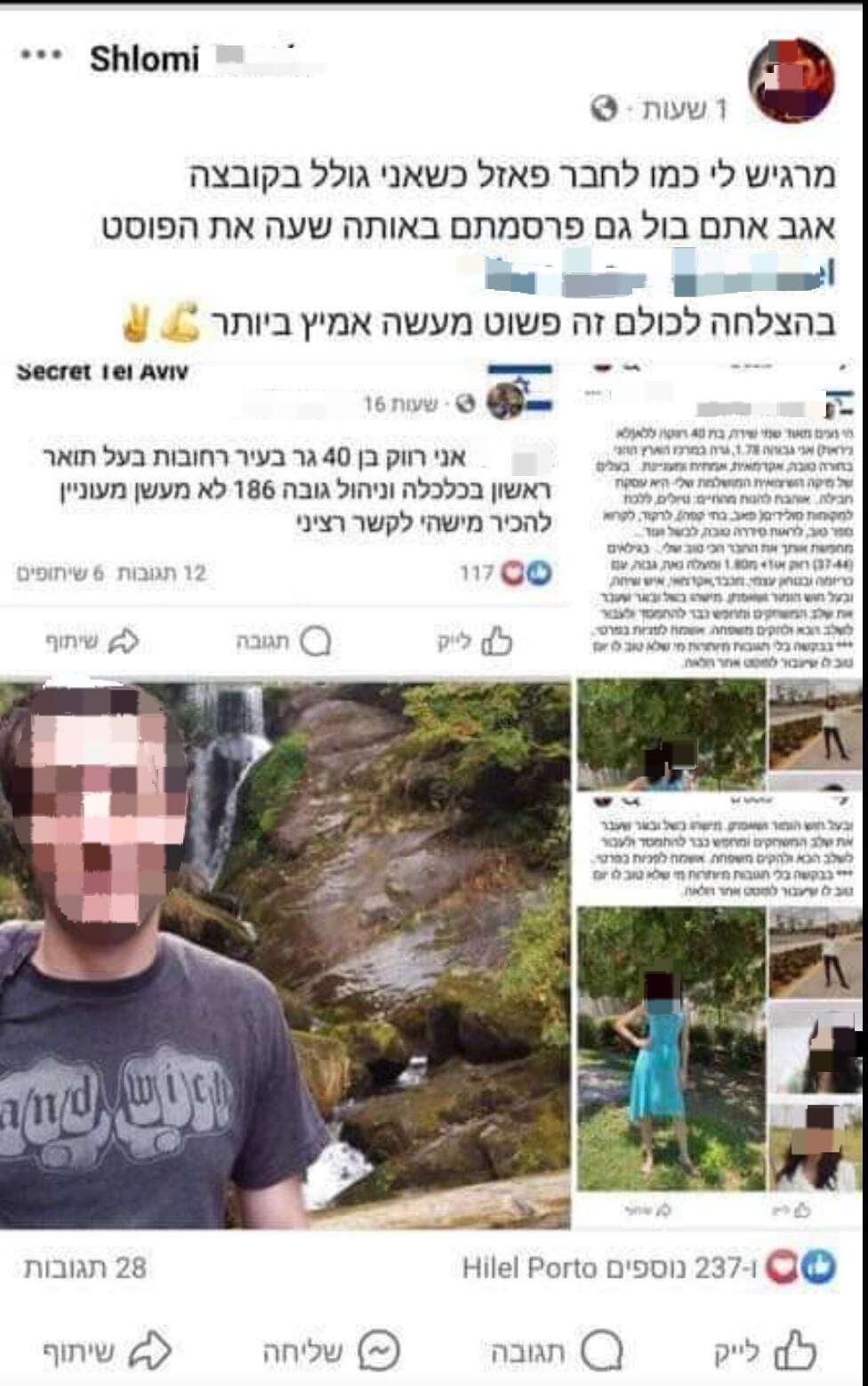 "בואי נגיד ככה. העליתי את הפוסט ויצאתי לטייל עם הכלב. זה בקושי היה באוויר כמה שעות, והטירוף התחיל עם אלפי תגובות ותיוגים. זה מה שגרם לאותה החברה בקבוצה להתעצבן כנראה כי הבנתי שהיא קיבלה גם המון תגובות בפוסטים שלה ובפרטי, וזה לא מצא חן בעיניה בלשון המעטה. היא העלתה פוסטים זועמים לקבוצה וגם התכתבה איתי בפרטי ודרשה שאסיר הכל. החלטתי לבוא לקראתה כי הכוונה שלי באמת לא הייתה לגרום להתנפלות של אנשים עליה. בסך הכל רציתי לעזור לשני רווקים למצוא זוגיות, אז הורדתי הכל. הבנתי שגם הם הורידו את הפוסטים בקבוצה ועכשיו נשארו רק צילומי המסך שגולשים הספיקו לתעד".