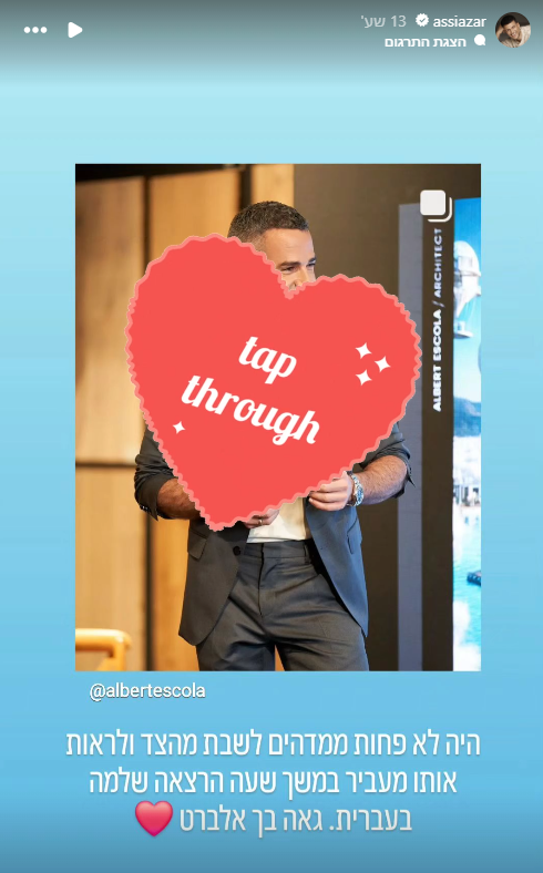 "היה לא פחות ממדהים לשבת מהצד ולראות אותו מעביר במשך שעה הרצאה שלמה בעברית. גאה בך אלברט", שיתף אסי לצד תמונה של בן הזוג ולב ענק ואוהב.