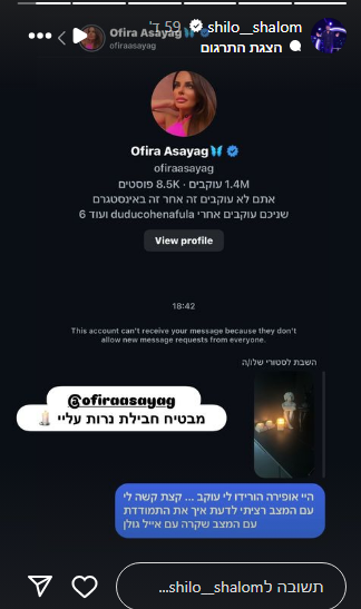 שילה שלום, לא רק שהכחיש את הקשר הזוגי המתפתח ביניהם, אלא גם בחר לעלות צילום מסך לסטורי שלו באינסטגרם מפנייה שעשה לאופירה אסייג וכתב: "היי אופירה, הורידו לי עוקב, קצת קשה לי עם המצב. רציתי לדעת איך התמודדת עם המצב שקרה עם אייל גולן".