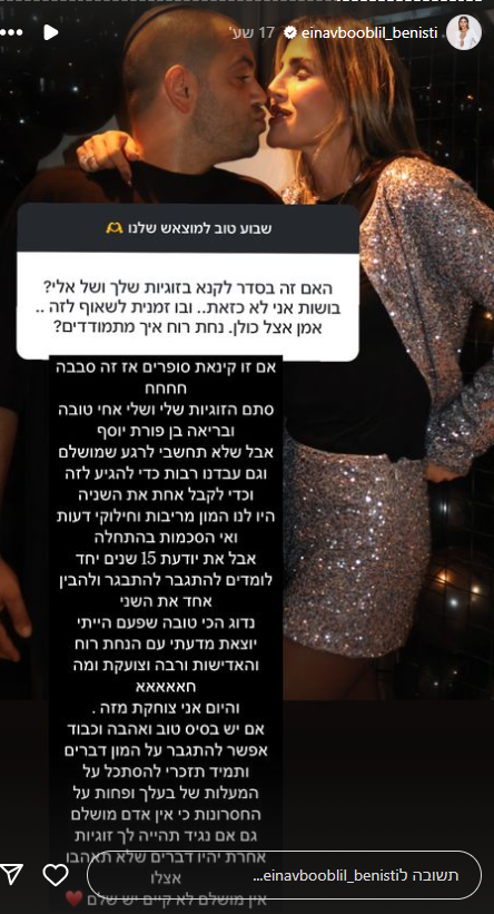 "פעם הייתי יוצאת מדעתי עם הנחת רוח והאדישות ורבה וצועקת והיום אני צוחקת מזה. אם יש בסיס טוב ואהבה וכבוד אפשר להתגבר על המון דברים. תמיד תזכרי להסתכל על המעלות של בעלך ופחות על החסרונות כי אין אדם מושלם. גם אם נגיד תהיה לך זוגיות אחרת יהיו דברים שלא תאהבו אצלו. אין מושלם, לא קיים. יש שלם", סיכמה כשבסטורי נוסף חלקה שבחים לאלי וכתבה: "שרק תשמח ותחייך ותחגוג כל החיים שלך מלך שלי. מגיע לך עולם ומלואו ויותר. שרופה לך על הבידה מזהב".