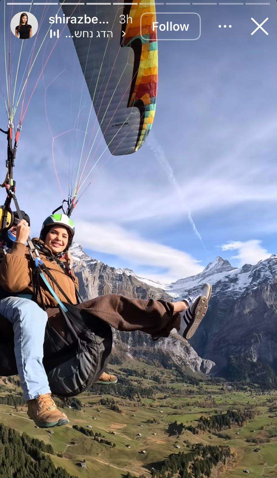 מוקדם יותר, שירז העלתה את הנופים הירוקים וההרריים, לצד סרטון של השניים במצנח רחיפה בשוויץ.
