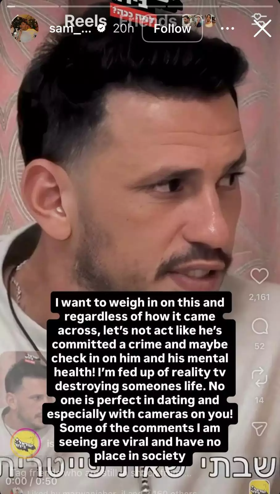"אני כבר שבע מזה שהריאליטי הורס חיים של אנשים. אף אחד לא מושלם בדייטינג, בטח ובטח לא כשמצלמות עליך. חלק מהתגובות שאני רואה ויראליות ואין להן מקום בחברה", סיכם, כשבכמה סטוריז נוספים שיתף בתגובות שקיבל מגולשים שהודו לו על דבריו, וכתבו לו כמה חסר קול כמו שלו שמבקש להרגיע את הרוחות.