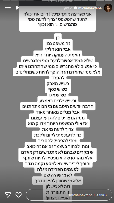 מעבר לכאב האישי, אי אפשר להתעלם מהמורכבות הנוספת שמגיעה עם הגירושים כשאתה דמות ציבורית. במקרה של מיכל, כל צעד, אמירה או שתיקה מתורגמים מיד לכותרות, פרשנויות וביקורת. אין מרחב לטעות, אין פרטיות אמיתית, והמאבק, שגם כך קשה , מתנהל מול עיניים בוחנות, שממהרות לשפוט. כשהגירושים הופכים לפומביים, הכאב הפרטי מקבל הד ציבורי, וההתמודדות דורשת לא רק כוח נפשי אלא גם עור עבה במיוחד.