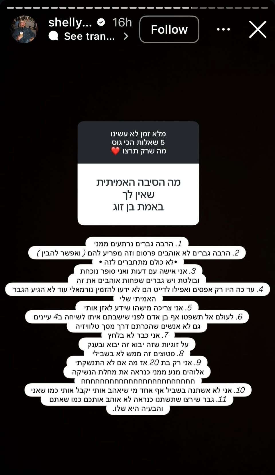 כשנשאלה על הסיבה האמיתית לכך שאין לה בן זוג, שלקה לא גמגמה וירתה רשימת תובנות שגרמה לכל רווקה בפיד להנהן ולברר איפה נרשמים לעונה הבאה של "אהבה חדשה". מבחינתה הבעיה היא לא בה - היא במי שמפחד לעמוד בקצב.