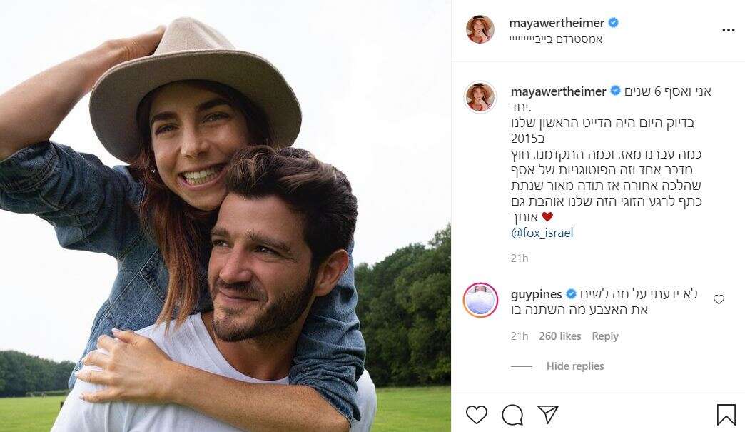 מאיה ורטהיימר העלתה אתמול (רביעי) פוסט לאינסטגרם עם תמונה שבה היא מצולמת כשהיא רוכבת על גבו של השחקן מאור שוויצר. "אסף ואני שנים יחד. בדיוק היום היה הדייט הראשון שלנו ב-2015", כתבה.