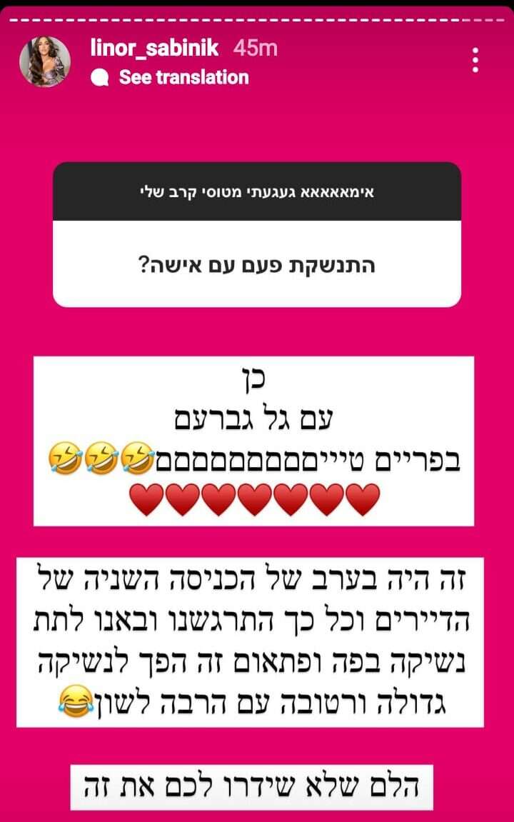 "התנשקת פעם עם אישה?", נשאלה סביניק (לתשומת ליבו של בן זוגה החדש של סביניק, רן גבאי) שענתה: "כן, עם גל גברעם בפריים טיים. זה היה בערב של הכניסה השנייה של הדיירים", נזכרה בימים בבית האח.