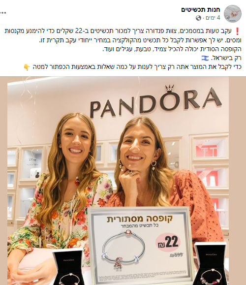 בחשבון שנפתח בפייסבוק תחת השם "חנות תכשיטים" מוצגת תמונה של שתי מוכרות לכאורה בסניף של רשת "פנדורה", כאשר לצידן שלט עליו כתוב: "קופסה מסתורית, כל תכשיט מהמבחר ב-22 שקלים במקום 599 שקלים״.