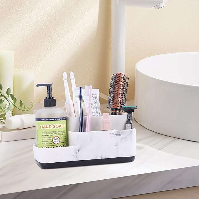 תוכלו להניח בצורה מסודרת את מברשות השיניים, משחות השיניים והסבון. הוא בעל בסיס גומי שמונע החלקה ובעל דפוס שיש אלגנטי שמתאים לכל סוג של חלל רחצה.