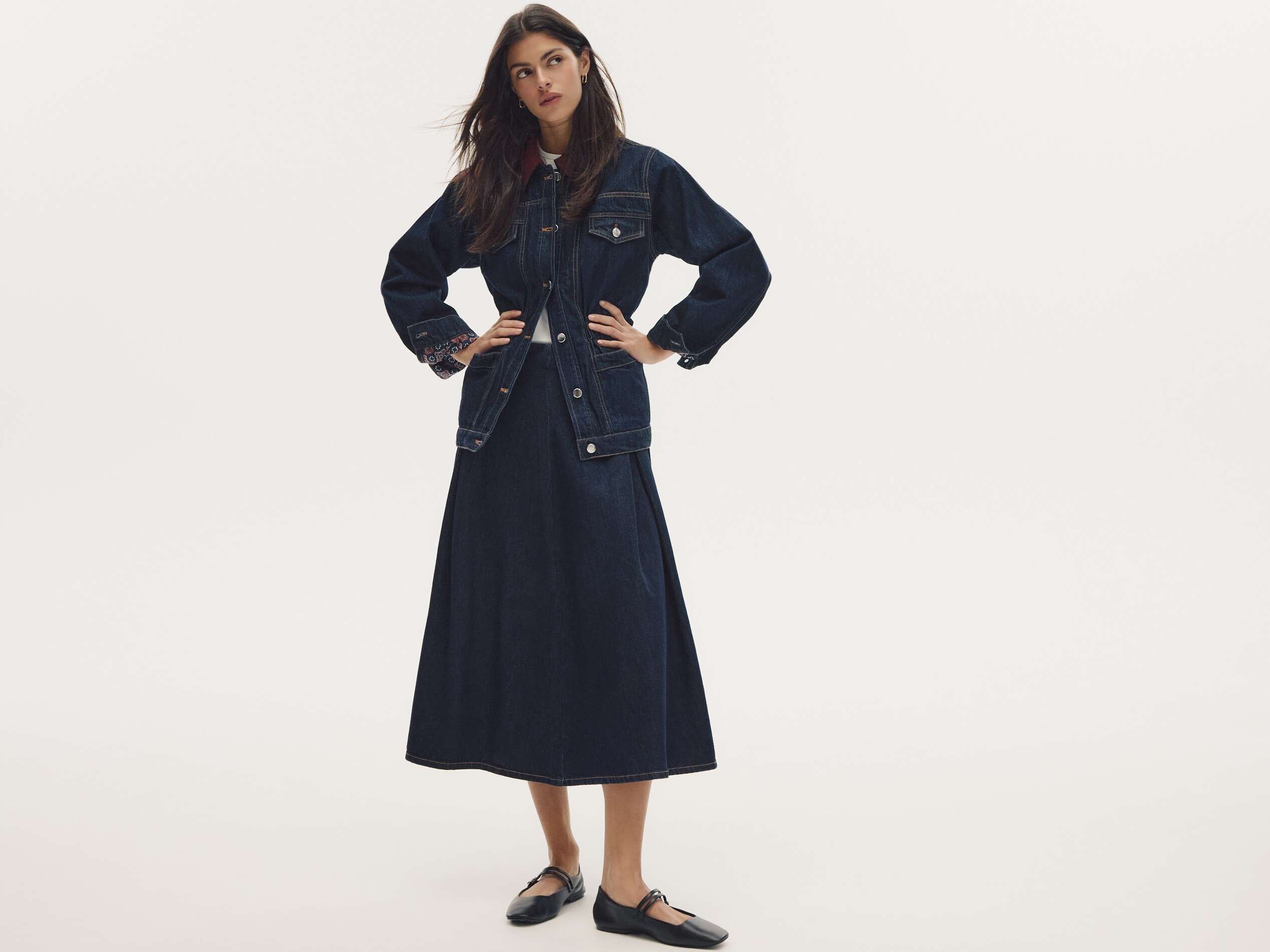 ריזרבד. חצאית ג'ינס מתרחבת 159.90 שקלים, ז/קט גינס עם צווארון ניגודי 229.90 שקלים / צילום: אסף לוי