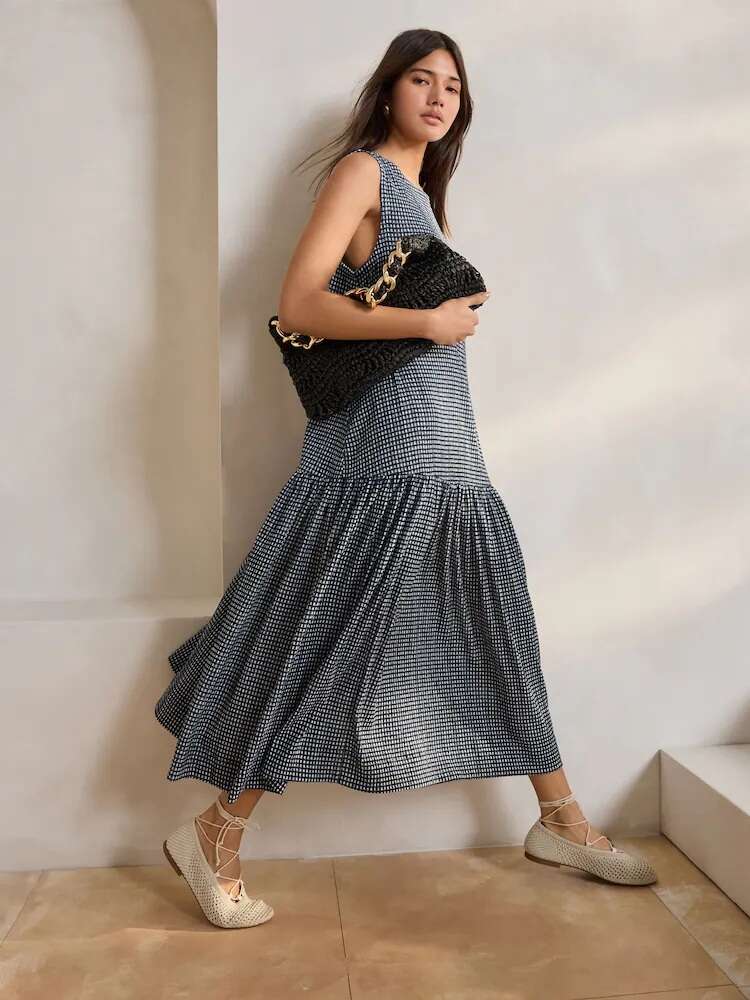 שמלת מקסי עם משבצות קטנות בצבעי כחול ולבן. מחיר: 120 שקלים / צילום מתוך אתר NEXT