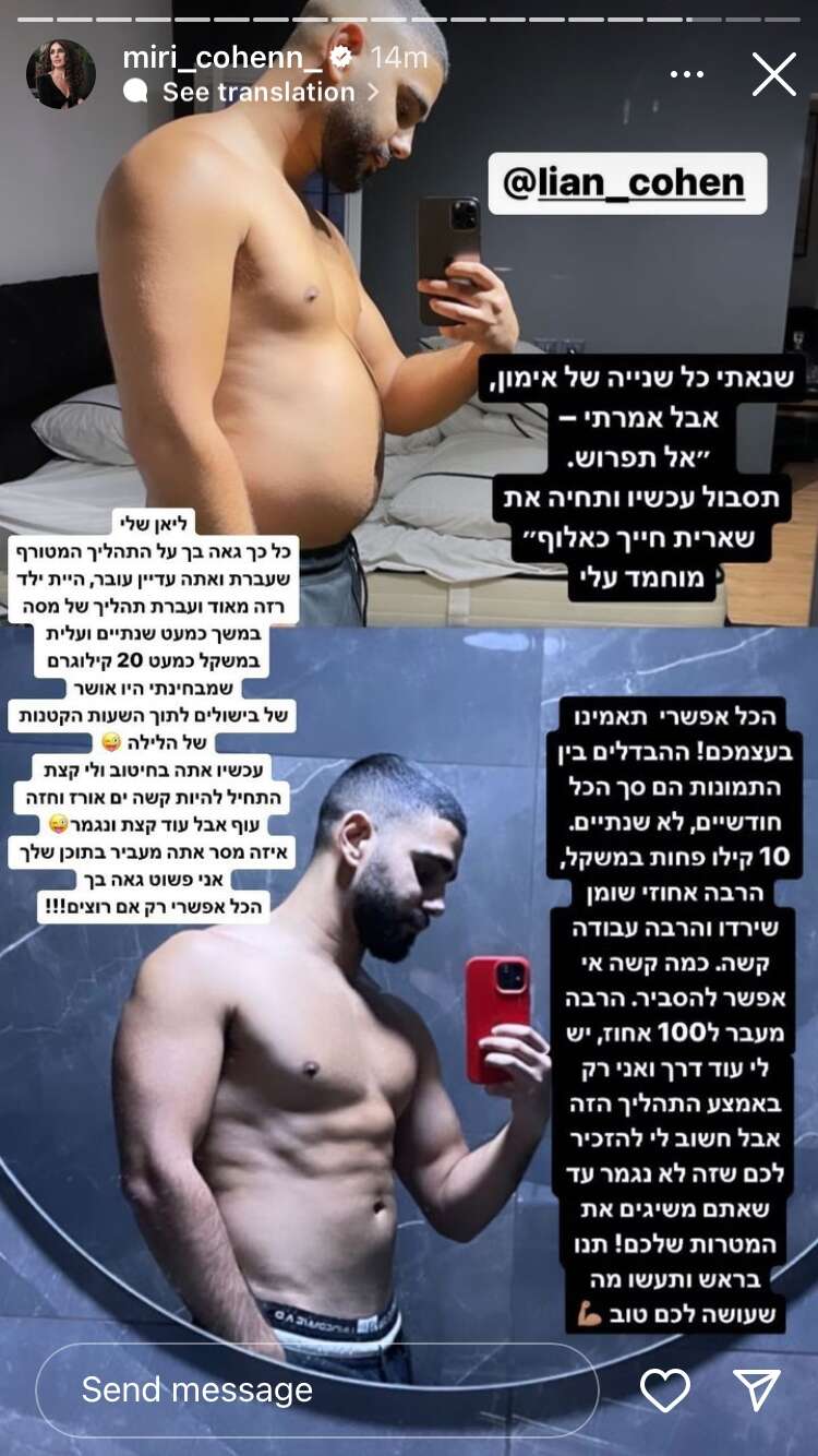 מכרס לקוביות ושרירים: ליאן כהן, אחיה של בעלת מותג הטיפוח אלין כהן ובנה של כוכבת "האח הגדול" מירי כהן, העלה היום (רביעי) סטורי שבו חשף את המהפך הגדול שעבר במראה שלו, כשהציג תמונה שלו מלפני חודשיים עם כרס – ומנגד, צילום עדכני מהיום כשהוא מתהדר בפיגורה חטובה ושרירית, בתוספת קוביות בבטן. באותה הזדמנות, הוא יצא במסר מעצים לכמעט 78 אלף עוקביו, כשקיווה שסיפורו ישמש להם השראה.