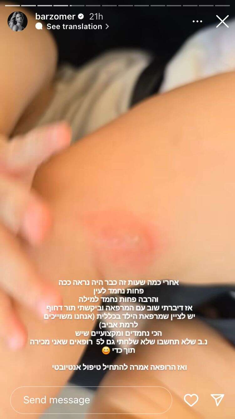 בהמשך הציגה זומר את ההחמרה במצב. "אחרי כמה שעות, זה כבר נראה ככה", כתבה על רקע תמונה נוספת שבה ניתן לראות החמרה במצב השלפוחית ברגלה של מילה. "פחות נחמד לעין. אז דיברתי שוב עם המרפאה, וביקשתי תור דחוף. שלא תחשבו שלא שלחתי גם לחמישה רופאים שאני מכירה תוך כדי. ואז הרופאה אמרה להתחיל טיפול אנטיביוטי".