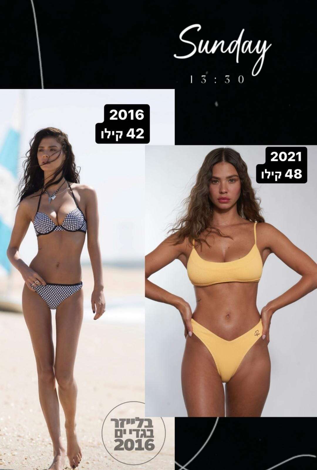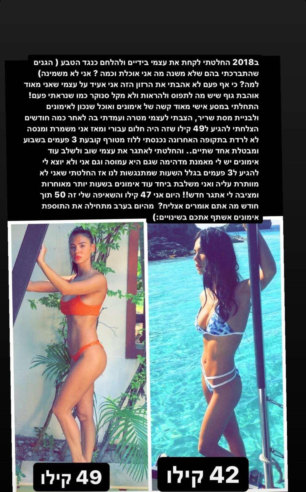 "הצבתי לעצמי מטרה ועמדתי בה. לאחר כמה חודשים הצלחתי להגיע ל-49 קילו שזה היה חלום עבורי. היום אני 47 קילו והחלום שלי זה להגיע ל-50", סיפרה והוסיפה לסטורי גם סדרת תמונות הממחישה את השינוי במבנה גופה לאורך התהליך.